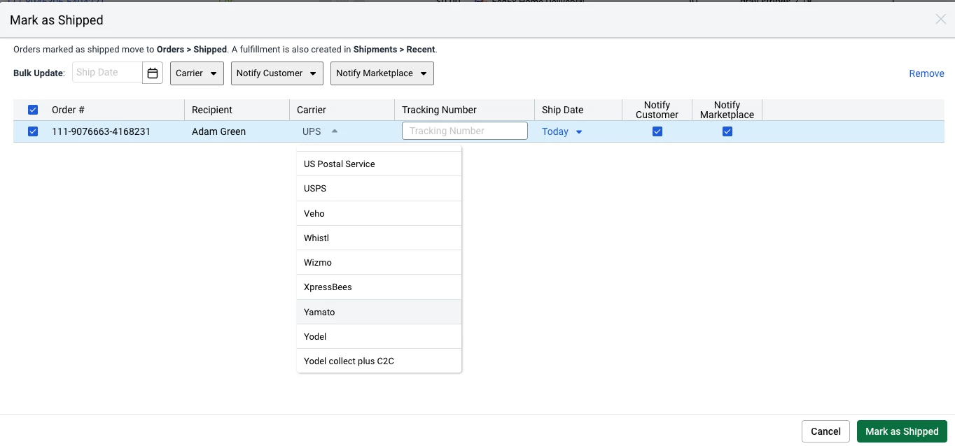 requesting to add Yun express carrier. so we can select the correct carrier and fill out the tracking number. so amazon platform would load that same tracking infomation. otherwise we would need to muanully add it tracking to amazon, it’s time consuming!