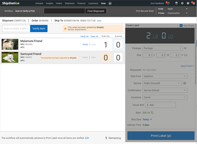 If you are not ready to immediately print a label for an order after it is verified, use Scan to Verify only so you are not offered the option to configure and print a label. Instead, ShipStation will allow you to immediately scan the next order.