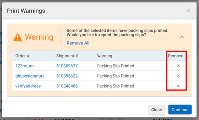 - Remove documents from the Print Warning pop-up: We’ve resolved an issue with the Print Warnings pop-up so documents will now disappear as expected when you click to remove them. Previously when printing via ShipStation Connect or downloading a PDF, some merchants still saw these documents after removing them from the queue.