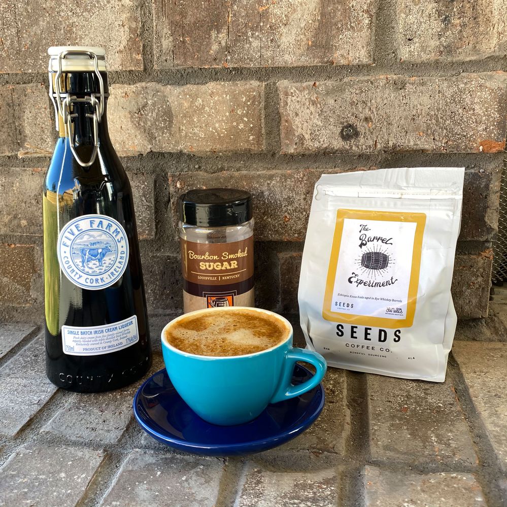 Here's a wonderful concoction that I came up with. This starts with a double shot of espresso from freshly-ground coffee beans that were aged in a whiskey barrel. As if you were making a latte, you steam and very slightly froth Five Farms Irish Bourbon Cream and add it to the espresso. Top it all off with BourbonSmoked Sugar.