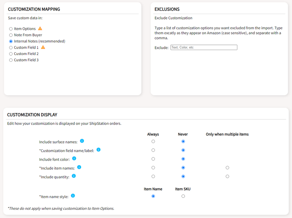 - Choose where you display the customization: item options, Internal Notes, Customer Notes, etc. - Include/exclude surface names, item names, quantity, etc.